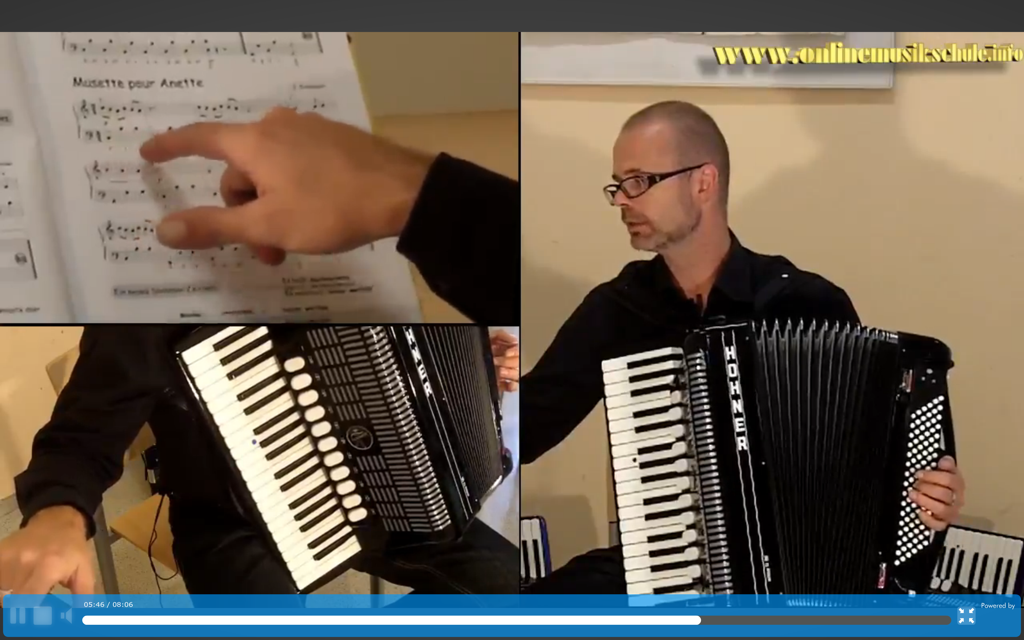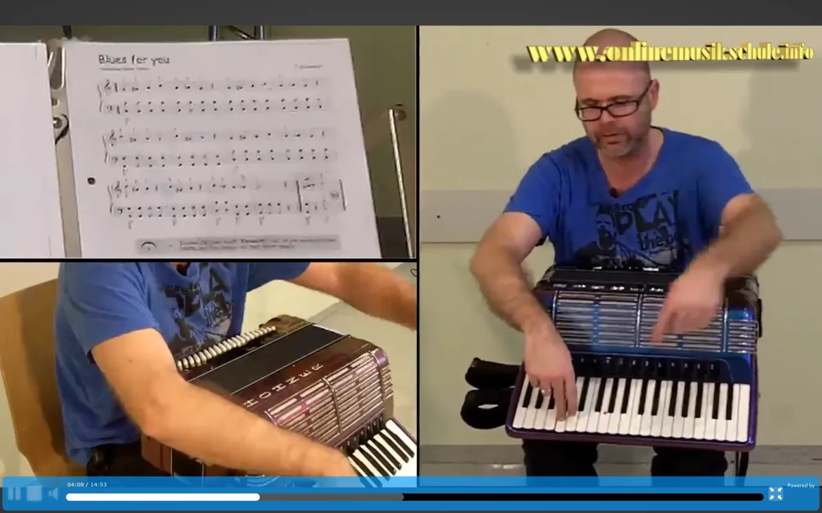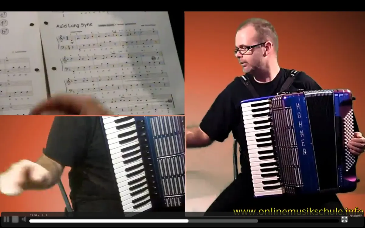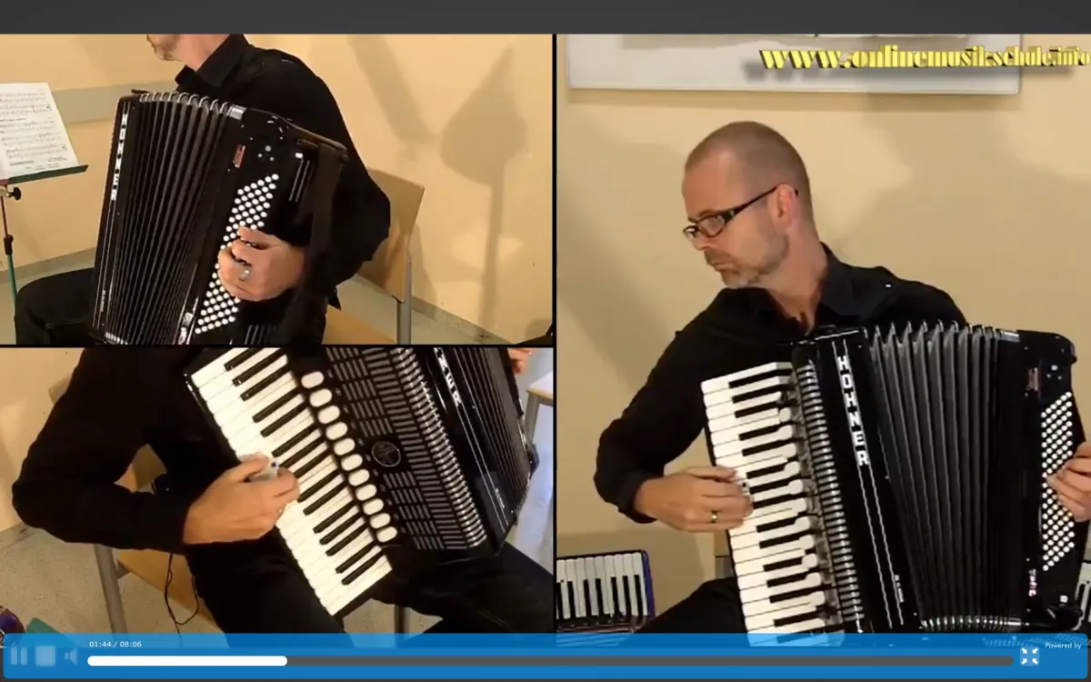 Mit 3 HD Kamerapositionen kannst du alles genau sehen. Rechte Hand (Diskant), Linke Hand (Bass+Akkord) sowie eine Kamera für die Notenansicht.