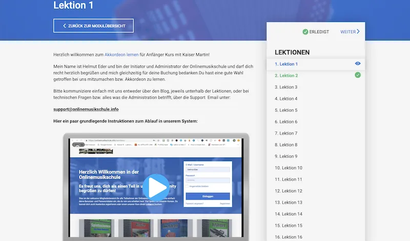 mit wöchentlichen Freischaltungen, damit du genug Zeit zum Üben hast und der pädagogische Fortschritt gewährleistet ist. Wir wollen ja, dass du richtig Akkordeon spielen lernst und keindenn schon einmal freigeschaltete Lektionen bleiben IMMER frei zugänglich. D.h. auch wenn du mal eine Woche nicht üben kannst, weil du zB auf Urlaub bist, kannst du diese jederzeit nachholen und mitmachen
